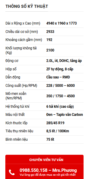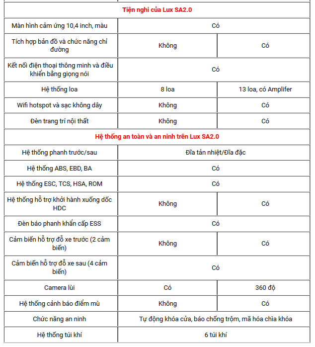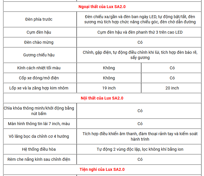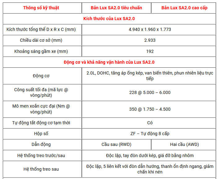 Chi tiết thông số kỹ thuật VinFast Lux SA 2.0</p>