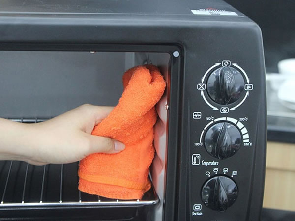 – Tắt lò đi và để nhiệt độ lò giảm xuống. Dùng giẻ ẩm lau sạch. Bạn cũng có thể tận dụng trực tiếp vỏ chanh để làm sạch vết bẩn bám cứng đầu, sau đó dùng giẻ ẩm lau sạch như bình thường.