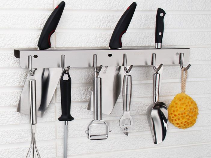 Giá đặt dao Inox 304 cao cấp rất tiện lợi, có thể đặt được từ 6-10 chiếc dao to nhỏ khác nhau và treo rất nhiều vật dụng cẩn thiết khác trong bếp như kéo, muôi ….
