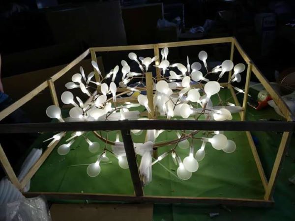 Những chiếc đèn là những cánh hoa được các nghệ nhân khéo léo cắt từ những miếng mika, chạy theo nó là những bóng led ẩn mình dưới những cánh hoa tạo nên một không gian thật ấn tượng.