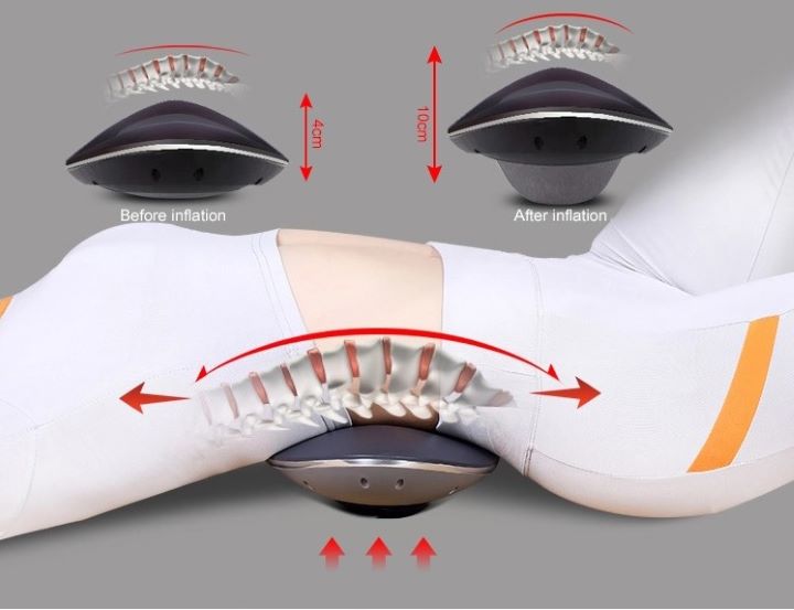 <div>1. Bơm hơi đẩy cao, kéo giãn cột sống lưng làm cho khoảng cách giữa hai đốt sống được giãn ra, giải phóng tỳ đè lên đĩa đệm, đĩa đệm co lại không chèn vào dây thần kinh từ đó làm giảm các cơn đau nhức</div>