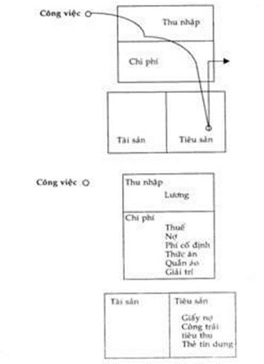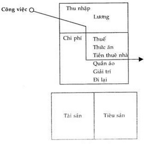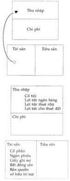 <p>Hình hộp ở trên là Bản kê lợi tức, hay còn gọi là Bản kê lời lỗ. Nó đo các khoản thu nhập và chi phí, tiền vào và tiền ra. Cái hộp bên dưới là Bản cân đối thu chi. Nó được gọi như vậy vì nó đòi hỏi phải có sự cân đối giữa tài sản và tiêu sản. Lý do chính gây ra những cuộc vật lộn tài chính đơn giản là vì người ta không biết được sự khác nhau giữa một tài sản và một tiêu sản. Nguyên nhân của sự nhầm lẫn chính là vì định nghĩa của hai từ này. Càng cố tra tự điển, bạn sẽ chỉ càng nhầm lẫn nhiều hơn thôi.</p>