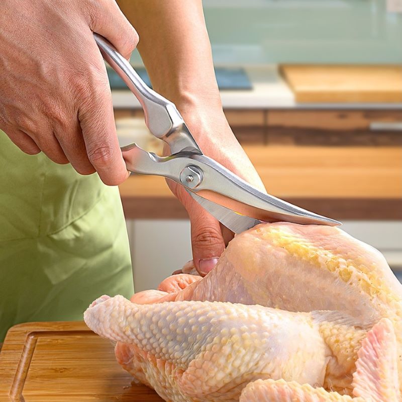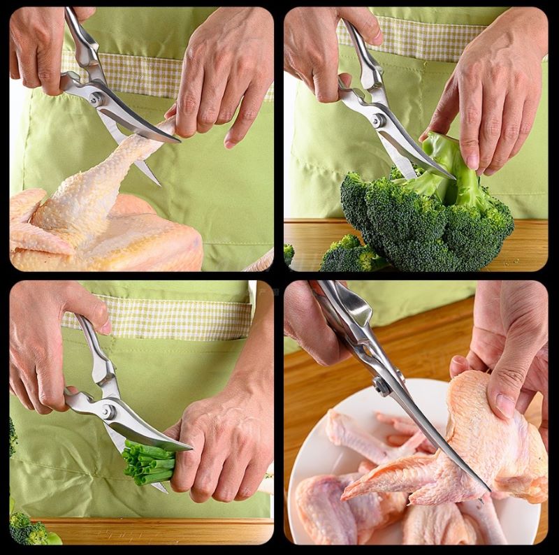 Chắc hẳn ai cũng đã từng loay hoay với món gà/ vịt. Để chặt gà, bạn cần chuẩn bị dao thớt, lót giấy … vì khi chặt nước bắn ra rất xa, khó tránh được bẩn sàn. Giải pháp đơn giản là sử dụng kéo cắt gà. Tuy vết cắt không đẹp bằng chặt, nhưng sử dụng kéo lại rất tiện, rất nhanh, không bị bắn như chặt.