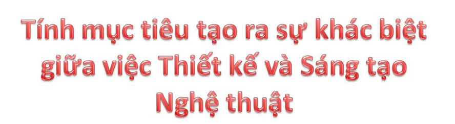 <p>- Tính mục đích của quá trình Thiết kế giúp phân biệt Sáng tác Nghệ thuật thuần túy và Làm Nghề. Nói cách khác, Thiết kế là Nghệ thuật vị Nhân sinh chứ không phải Nghệ thuật vị Nghệ thuật. Sự đáp ứng mục tiêu là thước đo quan trọng nhất đối với bản thiết kế.</p>