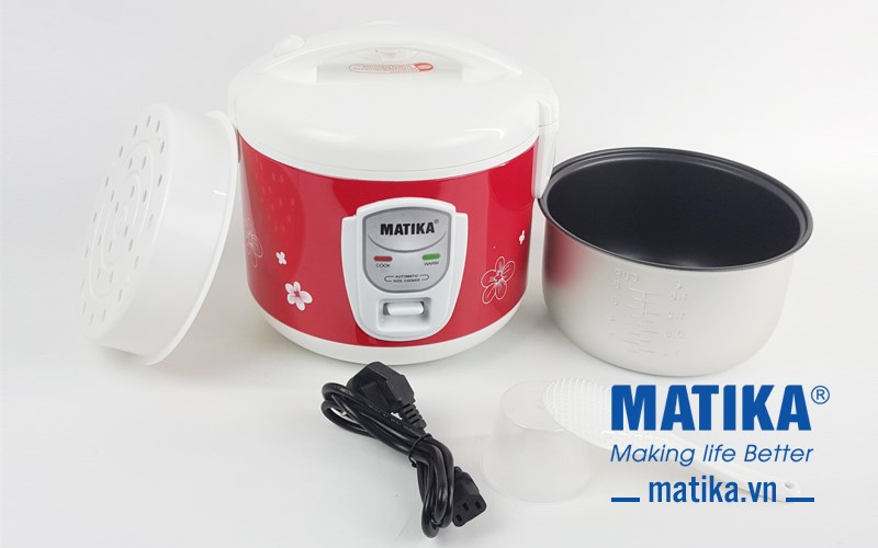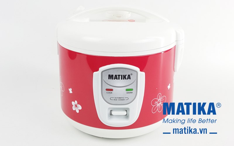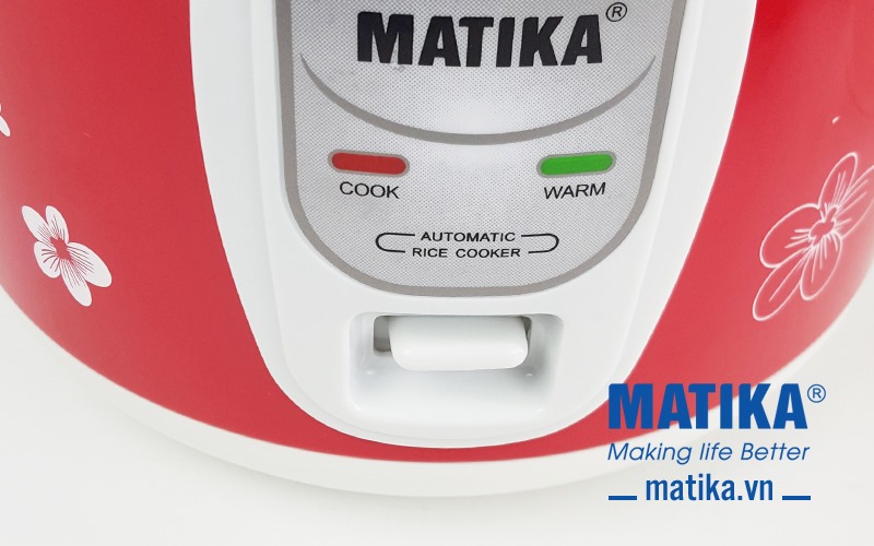 <div style="text-align: center;">Nồi cơm điện Matika MTK-RC1212 có thiết kế nổi bật với tông màu đỏ và trắng cùng văn hoa đẹp mắt quanh thân nồi</div>